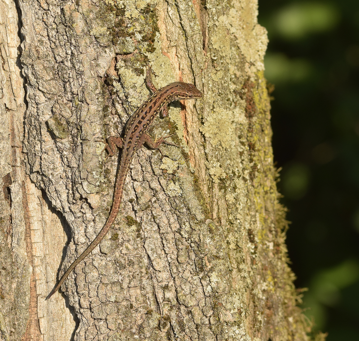 Giovane lucertola campestre mentre fa basking su un tronco. Foto di Thomas Pondrelli.